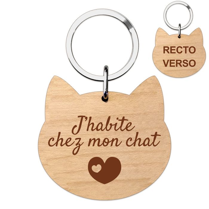 Nous avons décidé de vous proposer en exemple de texte de personnalisation la phrase "J'habite chez mon chat" pour un porte-clés humoristique, après à vous de décider de ce que vous voulez y indiquer dessus, pourquoi pas la gravure du prénom de votre chat, le numéro d'identification de votre animal pour toujours l'avoir sur vous, tout est possible. rendez le unique en créant votre porte-clés, qu'il soit humoristique ou pratique.