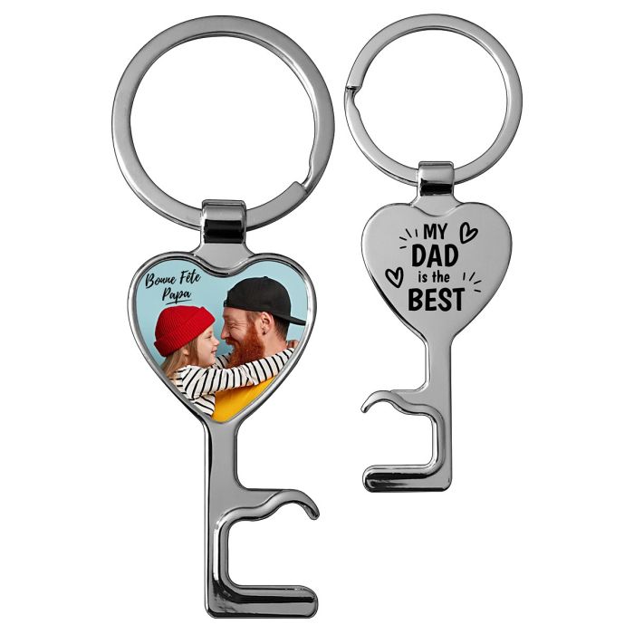 Joignez l’utile à l’agréable en offrant ce porte-clés photo cœur et décapsuleur à ceux que vous aimez. Faites de ce porte-clés original un objet unique en le personnalisant vous même de A à Z. Chargez directement sur notre site vos photos favorites de ceux que vous aimez, ou toute autre illustration qui vous tient à cœur. Nous imprimons ensuite votre personnalisation sur le cœur au recto du porte-clés. Au verso, vous pouvez y graver un logo ou un texte. Plus besoin de vous tirailler l’esprit en hésitant entre un décapsuleur classique et un pendentif cœur, optez pour ce magnifique objet deux en un, qui en ravira plus d’un comme cadeau !