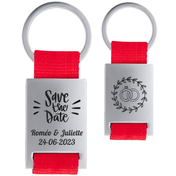 Un porte-clés personnalisé en métal équipé d'une sangle en tissu de couleur rouge passion. Avec ce modèle vous êtes sur d'avoir choisi le cadeau homme qu'il gardera pour toujours.