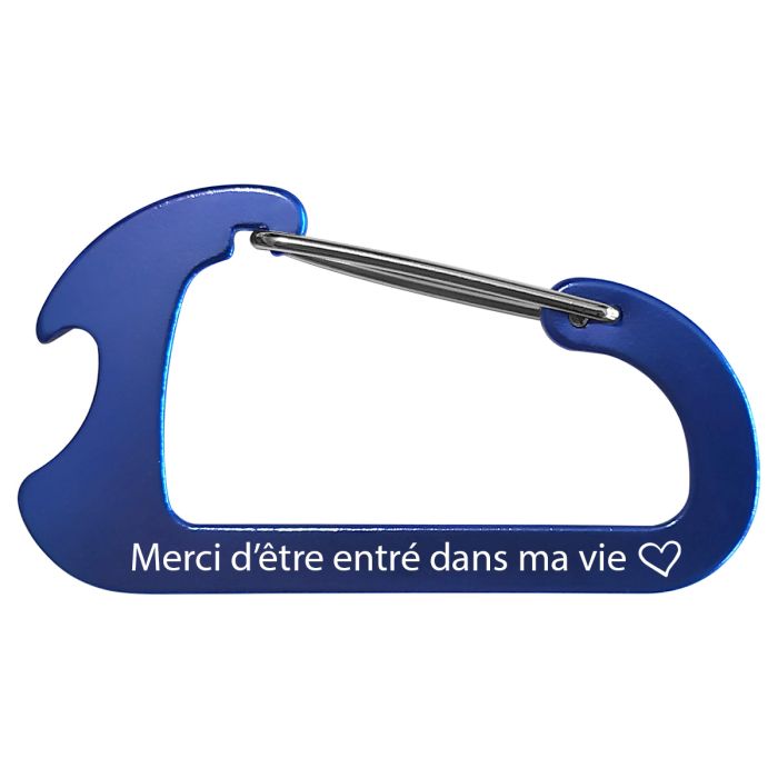 Porte-clés mousqueton personnalisable avec le texte de votre choix, pour attacher rapidement votre trousseau de clés de maison ou de voiture à votre ceinture. Ce porte-clés gravé fait parti de notre gamme de cadeaux originaux et ultra pratique à offrir ou à s'offrir. Un cadeau personnalisé que la personne emportera partout avec elle. De couleur noire ce mousqueton gravé se mariera avec élégance avec la plupart de vos tenue. Chic et élégant, pour homme, mais aussi pour femme, il pourra être attaché à un passant de ceinture ou bien à la bandoulière d'un sac. Ce mousqueton en aluminium est solide et très résistant, son emploi est multiple. Vous trouvez sa forme jolie ? Vous avez très bon goût, mais en plus de ça il vous servira au quotidien, puisqu'il s'agit aussi d'un porte-clés décapsuleur.