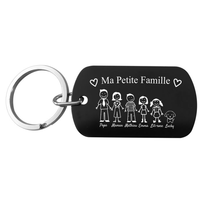 Caractéristiques et dimensions du porte-clés noir gravé ma petite famille :